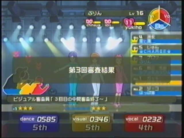わりと内容がイミフ って感じですので今回は対人初心者さんにわかりやすいように解説していきたいと思います。 ブログを始めて初めて「攻略」というものを書いた気がする・・・今までのは攻略っていうよりオデ解説だったしね。 上級者さんも初心に戻ったつもりで目を通して頂けたら嬉しいです。 誕生日祭というのは、たまに本スレに告知されますのでカンチされがちですが、避難所の企画です。 とりあえず基本ルール↓ 開始 9:02PM 会場:MAKEDOG 【ルール】 ノーレッスン・ノーブースト。ユニットIL2~IL4 初心者はIL5でも○ 会場は負け犬です。つまり、別に一位にならなくてもいいです。 解説するに至ってILは3前提にします。 自分もIL3で出ていますしね。これには理由があって、初心者さん相手に低レベルとはいえ合格狙いの打ちはやりたくないからです。 皆が楽しくやってる中、自分だけ必死に合格打ちするなんてイヤじゃないですか。しかも合格するだけなら相応の打ちをすればいいので別に難しくないですし。 それならIL5で入って満点×2とった後にノーアピール17点合格のほうを選びます(笑 パラメータについては特化にするか円形パラにするか迷いますが、個人的には円形パラをオススメします。 それは特化パラだと勝つのにハイレベルなテクニックを要求される事があるからです。 23特化パラメーターで自分が23プレス×2→12プレスをしたら流2だけがジェノサイドしたり、13特化にしたら1だけが帰ってしまったなんてことは経験したことがありませんか? それを「運」で済まさないように色々試行錯誤する必要があるからです。 具体的には23特化ならば流行1位のアピール点数が1点だけだとしても、1スピアを狙ったり、 流1を3.5。流2を2、流3を3.5と叩いて流3だけ取得したりetc 13特化で23プレスをして3だけ取得する等(当然2は取れません。13プレス×2のあとの流3のみ取得で16点合格を狙います しかも叩くタイミングを考え、流行1位を4人取りにいっているとうまくコーメイの罠にハメる必要もあります。前後の流れも把握しておく必要もあります。 普通に敷居が高いので初心者さんだからこそ円形パラをオススメします。 それに比べ円形パラは、ぶっちゃけ高テンションでjaさえ取れて、ILが3以上あれば、13プレス、23プレス、12プレスの3点セットの決め打ちで何も考えて無くても7割は合格出来ます。皆の動きをよくみて順不同で使えば負けるのは負け犬祭を通して1、2回のみでしょう 1スピアの有効性は皆無と言って良い程無いです。 そもそもスピアはボム潰しなので、ノーボムの負け犬では無意味な事が多いです(たとえ意味があったとしても最善手になることはほぼありませんし、1ジェノったら終わりですしね これは1スピアに限らず2スピアにも同じ事が言えます。 ノーボム負け犬で安定して勝つ為のコツは、 ・休ませろ! ・ジェノサイドを考える! ・jaは取る! 1st狙いとなるとまた話が変わってきますが、今回は初心者さん向けということで以下略。 こんなところです。次回の負け犬(10月25日)の参考にしていただけたらなと。 読み直すとどうも難しい内容になってしまった気がしないでもない(・∀・;) まあ要するに上のみっつをやればいけるはずです。 ゴタゴタ考えるのがめんどい人はとにかくアイドルだけは休ませましょう(笑